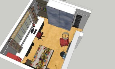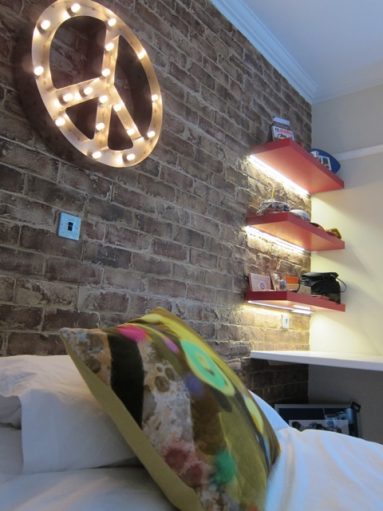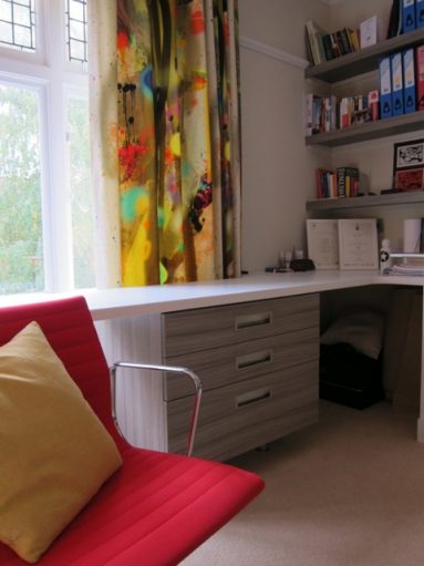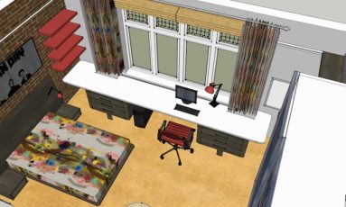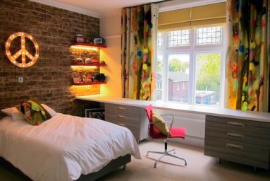 After some successful exam results my client’s son was treated to a bedroom makeover. At 6’2” he’d outgrown his cabin bed and needed a big desk to work at. We encouraged him to put together a mood board and, with our help, he chose a brick wall effect (made by the set design team behind the Harry Potter films) lighting from theworkshopbelow.com, Timourous Beasties’ Graffiti velvet curtains on a bronze metropole track, a crisp white Corian worktop with undermounted cabinets to allow for a toasty column radiator and curtains behind and a new bed with a specially commissioned walnut headboard featuring Anglepoise wall mounted lamps with specially made toggle switches. We also designed a huge sliding mirror door wardrobe to hide all his rugby and cricket gear and created glass fronted cubby holes – to easily see all his smalls!